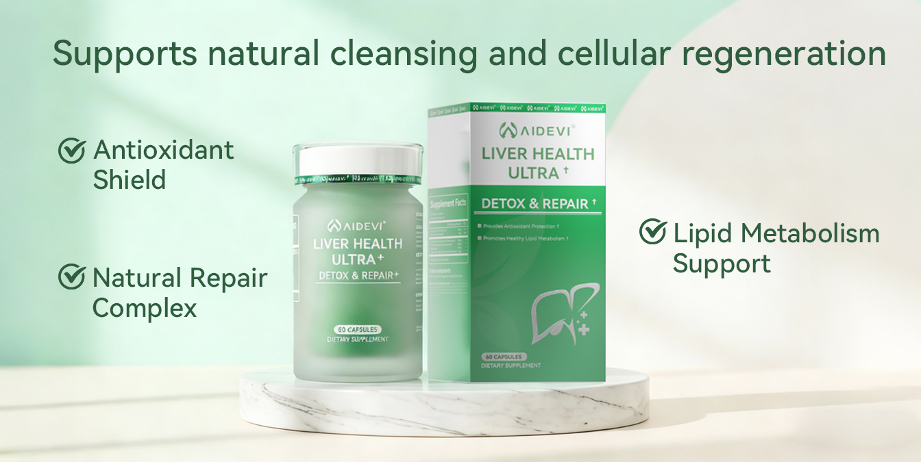 Support your body's most vital detoxification organ with AIDEVI LIVER HEALTH ULTRA. Our advanced DETOX & REPAIR formula features Cynamed® Artichoke, Reishi Mushroom, Curcuma Root, and Fucoxanthin to promote comprehensive liver detoxification, cellular repair, and antioxidant protection for optimal liver function and vitality.
